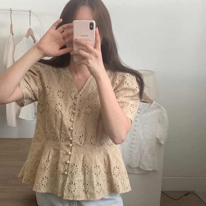 サマーVネックスタンダードスリーブバックルウェストニットシャツ トップス レッド レトロ 刺繍 夏物 ICC_レディース8901769