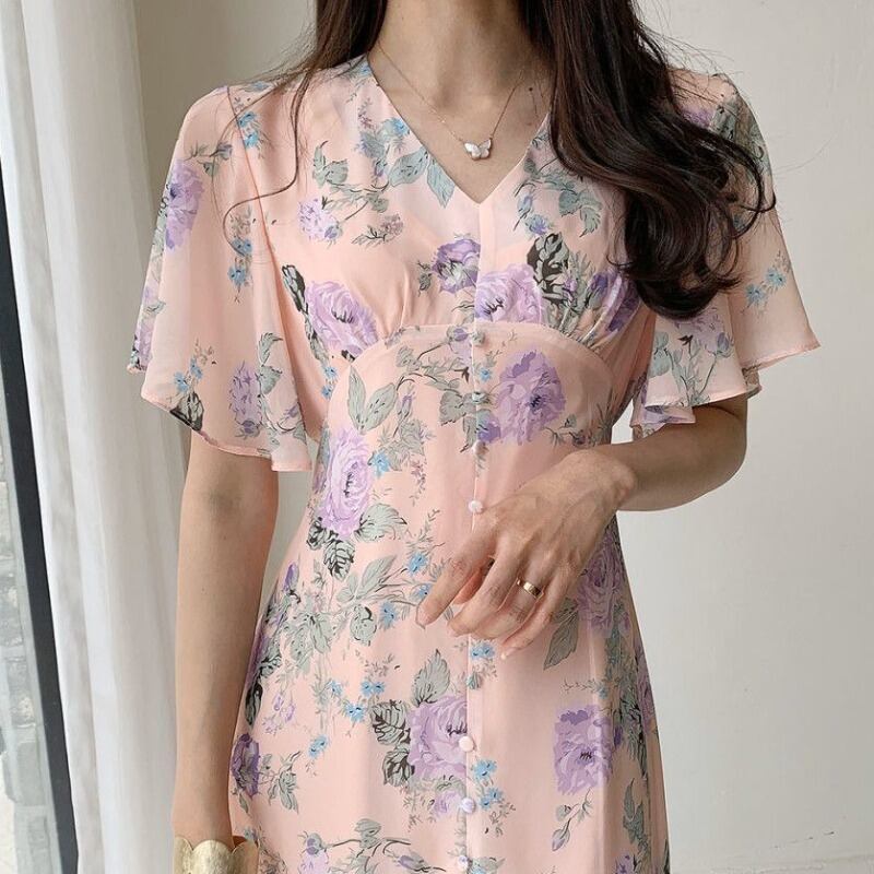 スカート サマーウェストフローラルシフォンVネック薄手ドレス 夏物 花柄 ICC_レディース4267518