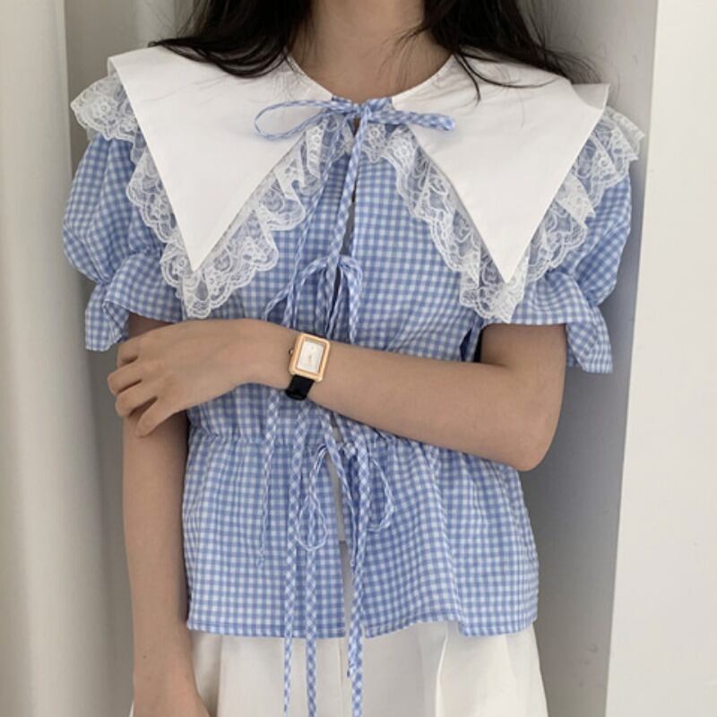 カラー半袖スリーブシャツ サマースタンダードハイウェストウェストコート ショート レトロ ハーフスリーブ 夏物 ICC_レディース4930694