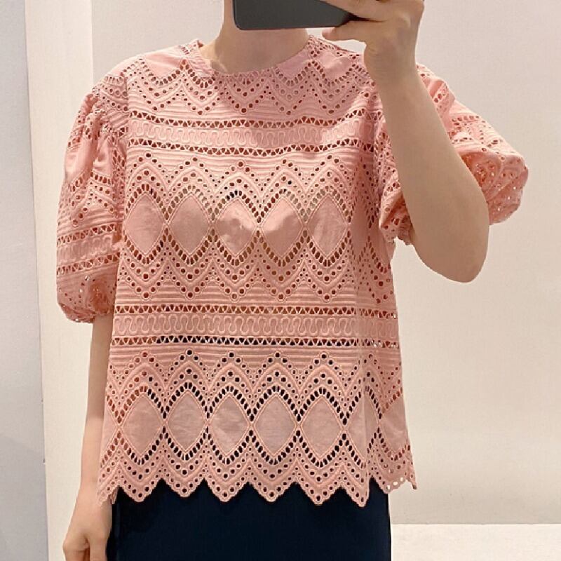 レースシャツ サマーラウンドネックスタイルルーズ薄手半袖スリーブトップス ショート ハーフスリーブ 夏物 Oネック ICC_レディース7477118