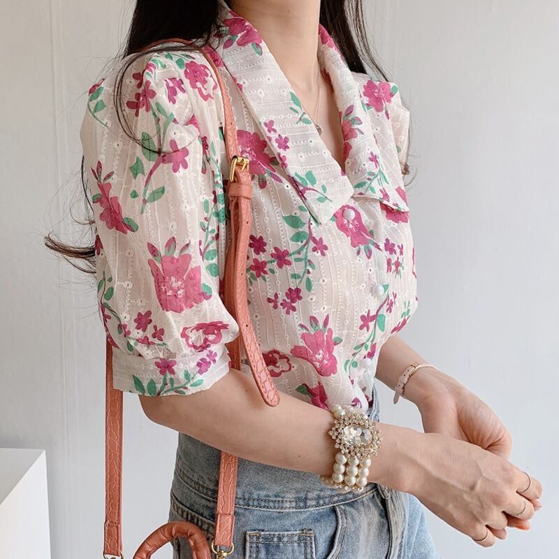 サマースタイルシャツ プリント柄トップス スタンダード レッド レトロ 刺繍 夏物 ICC_レディース3931011