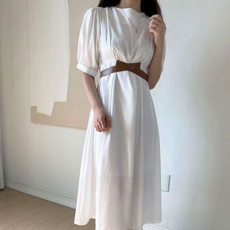 スカート サマーラウンドネッククロスレースウェストスリムドレス 夏物 Oネック ICC_レディース2615086