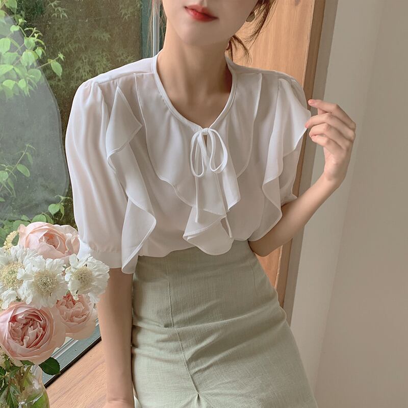 サマースタンダードホワイトシフォンシャツ トップス レトロ 大人ガーリー スウィート キュート カジュアル 夏物 左左右右1118698