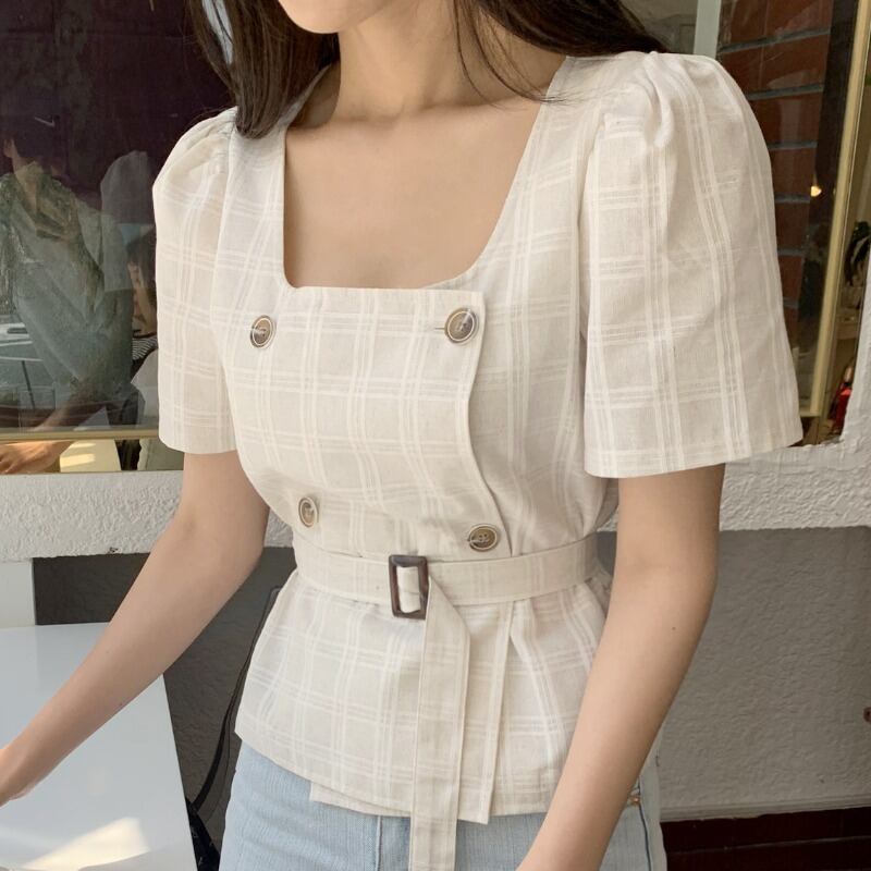 サマースタンダード格子柄ダブルブレストシャツ カラー半袖スリーブトップス レディース ショート レトロ ハーフスリーブ 夏物 スクウェア ICC_レディース0867353