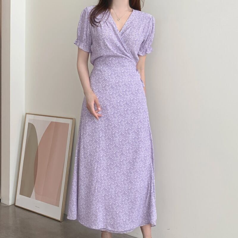 スタンダードワンピースシフォンドレス ロングウェスト薄手フローラル レトロ 花柄 ICC_レディース8069433
