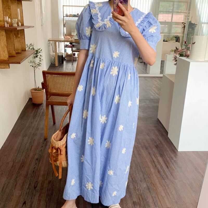 スカート サマースタンダードカラー薄手ルーズドレス レディース レトロ 夏物 ステッチ ICC_レディース4002698