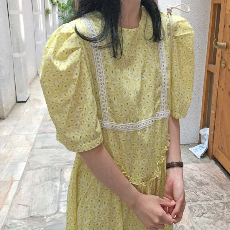 スタンダードプリント柄ラウンドネックレースルーズスリーブドレス レトロ Oネック ステッチ ICC_レディース9066047