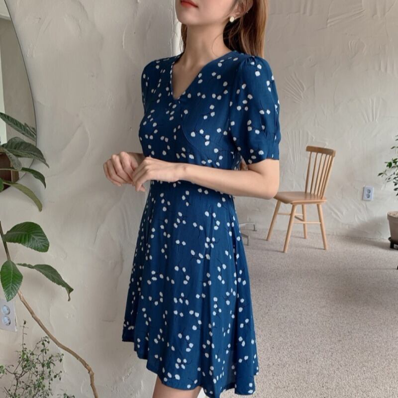 サマースタンダードウェストシフォンフローラルVネックドレス レトロ 夏物 花柄 ICC_レディース1220343