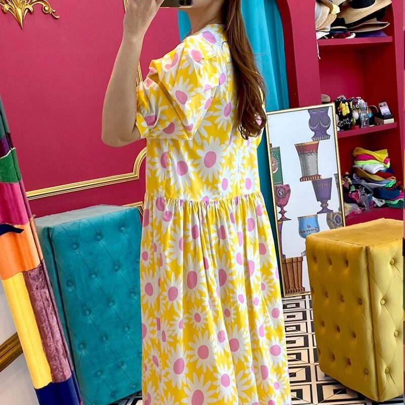 スカート サマースタンダードFlowerデザイン プリント柄カラースリーブドレス レトロ 夏物 フラワーデザイン ICC_レディース2177937