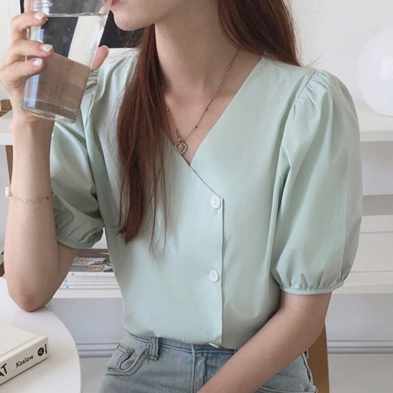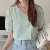グリーンショートVネックスリーブトップス カラーボタン半袖シャツ ランタンスリーブ ハーフスリーブ ICC_レディース2322892
