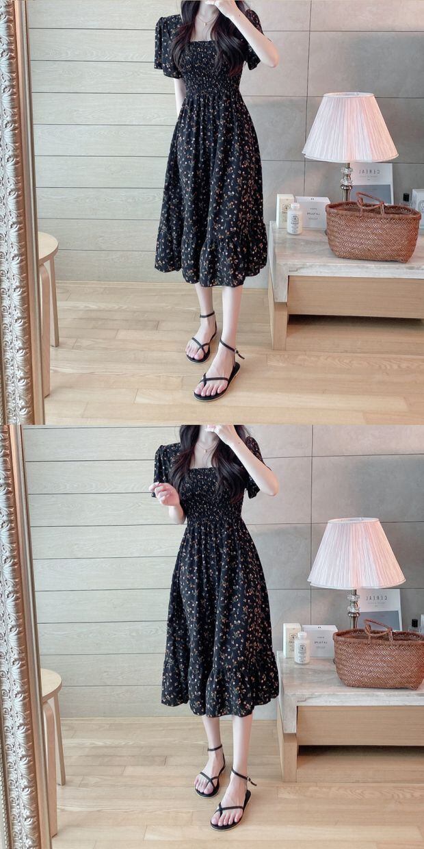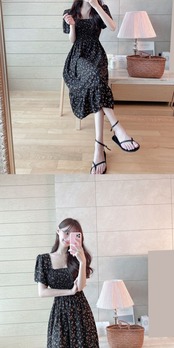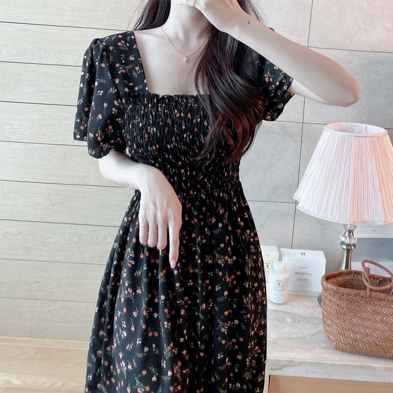サマーブラックスカート ウェストシフォンフローラルドレス 夏物 花柄 左左右右0189193