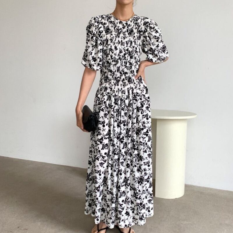 スカート サマースタンダードプリントストレッチロングドレス コットン レトロ エラスティック 伸縮 夏物 ICC_レディース7158125