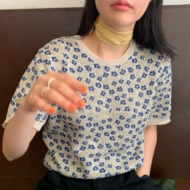 サマースタンダード薄手フローラルラウンドネックプルオーバー Tシャツ シャツ セーター レディース レトロ 夏物 花柄 Oネック ICC_レディース9594906