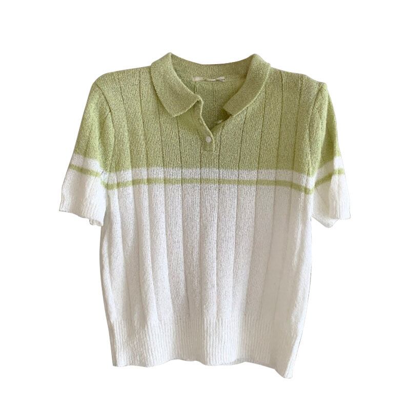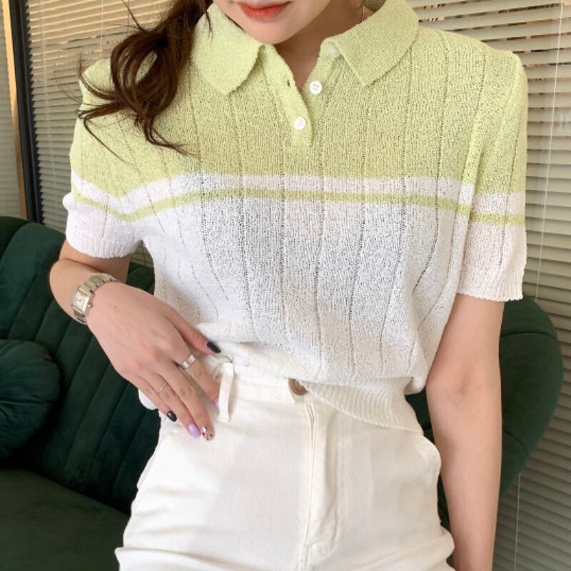 サマーシャツ 薄手ジャケット ストライプニット半袖スリーブTシャツ ショート ハーフスリーブ 夏物 ICC_レディース3456169