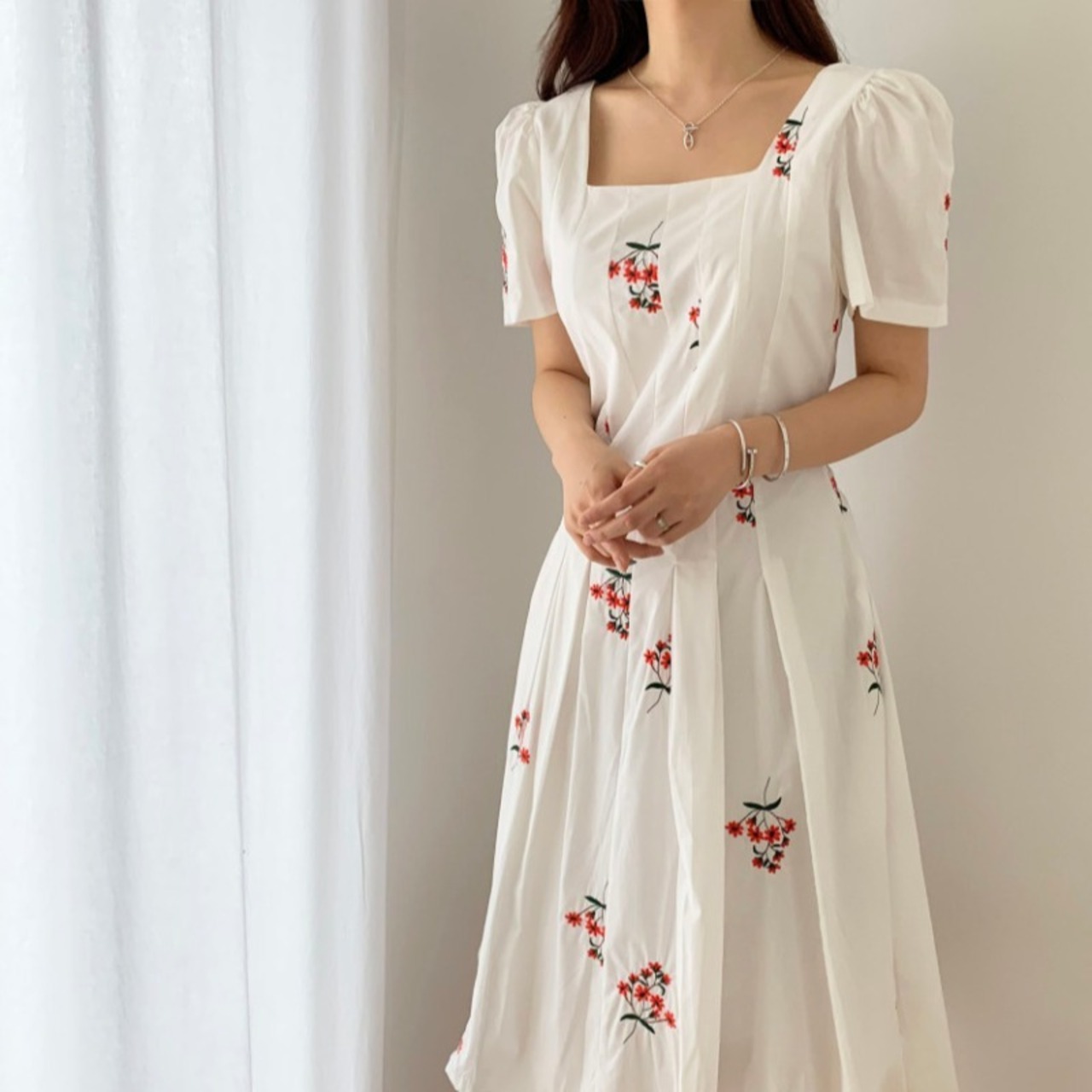 フローラルプリーツヴィンテージウェストドレス レッド 刺繍 花柄 スクウェア ビンテージ ICC_レディース3889270