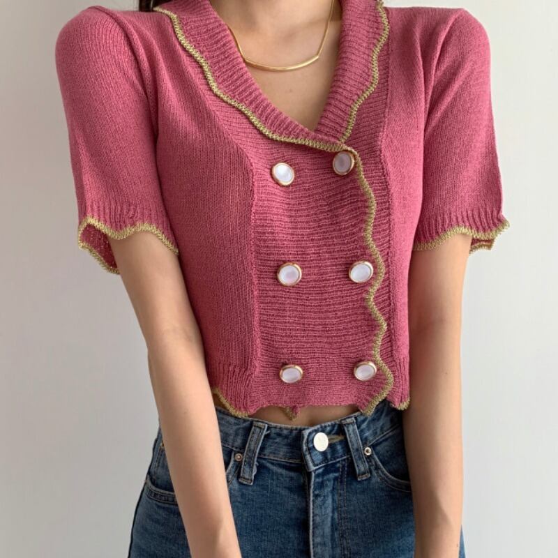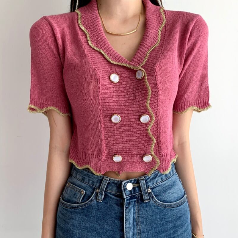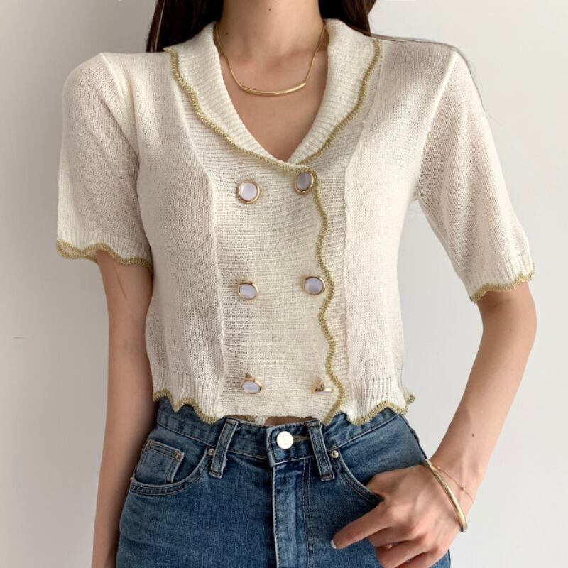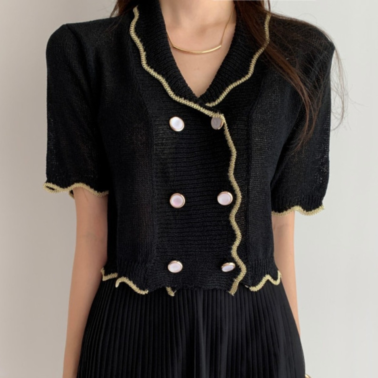 サマー薄手ショートカーディガンダブルブレストジャケット セーター レディース 夏物 シルク ICC_レディース7555381