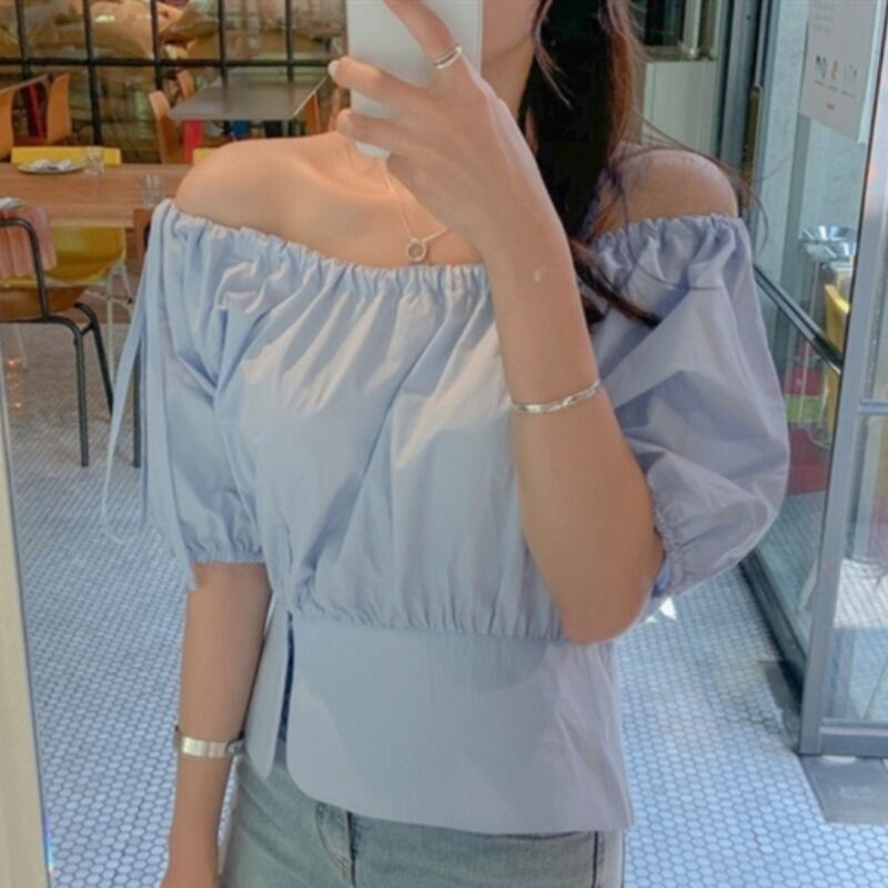 サマースタイルギャザーストラップレススリーブ半袖シャツ レディース ショート ハーフスリーブ 大人ガーリー スウィート キュート カジュアル 夏物 ICC_レディース9336185