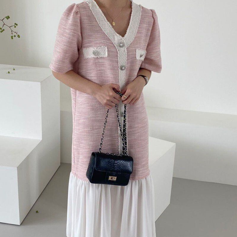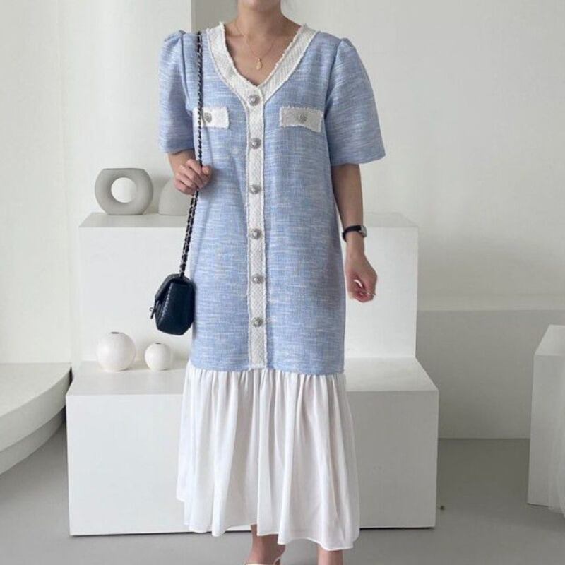サマースタイルVネックボタンドレス ロングスカート 大人ガーリー スウィート キュート カジュアル エレガント 夏物 ステッチ ICC_レディース8889183