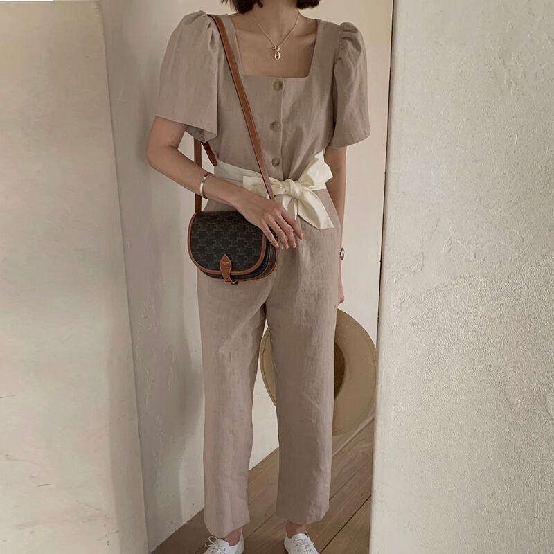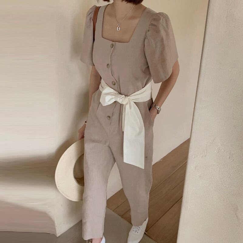 サマースタンダードカラーハイウェストウェストカジュアルパンツ 薄手ジャンプスーツ オールインワン ベルト レトロ 夏物 ハーネス スクウェア ICC_レディース5902155