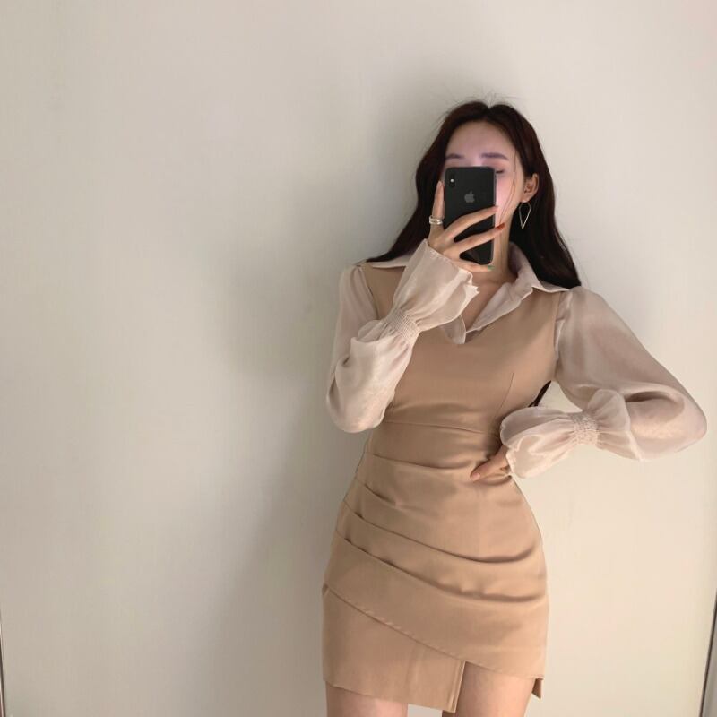 Flowerデザイン スリーブシャツ スリムプリーツドレス ショートスカート フラワーデザイン ICC_レディース0126176