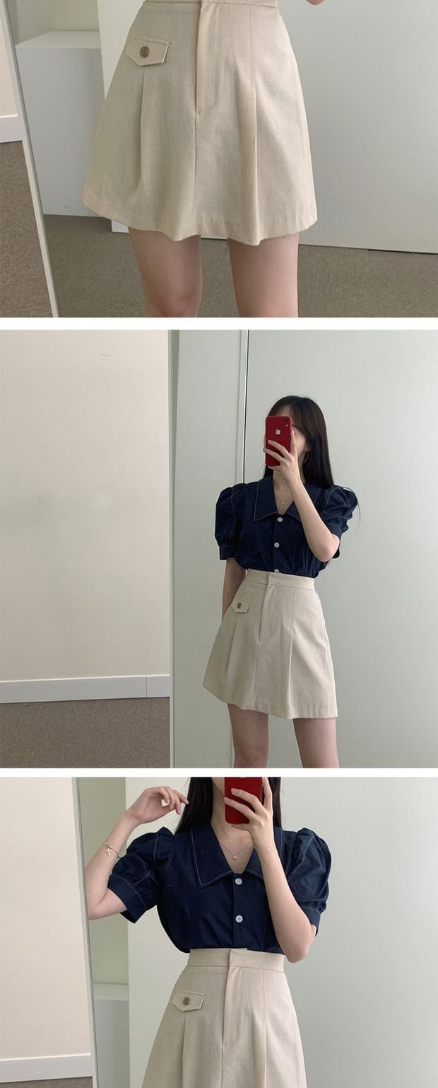 サマースリーブトップス ソリッド カラーシャツ ハイウェストショートスカート 夏物 ソリッドカラー 左左右右0432887