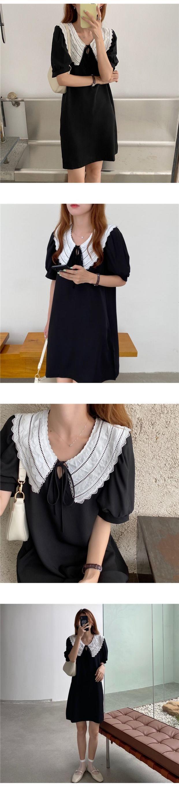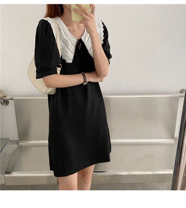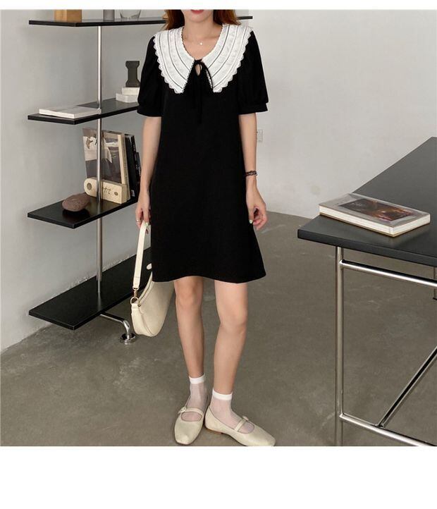 サマーレーススタンダードスカート スタイルルーズ半袖スリーブドレス ショート レトロ ハーフスリーブ 夏物 フラワーデザイン ステッチ 左左右右7080108