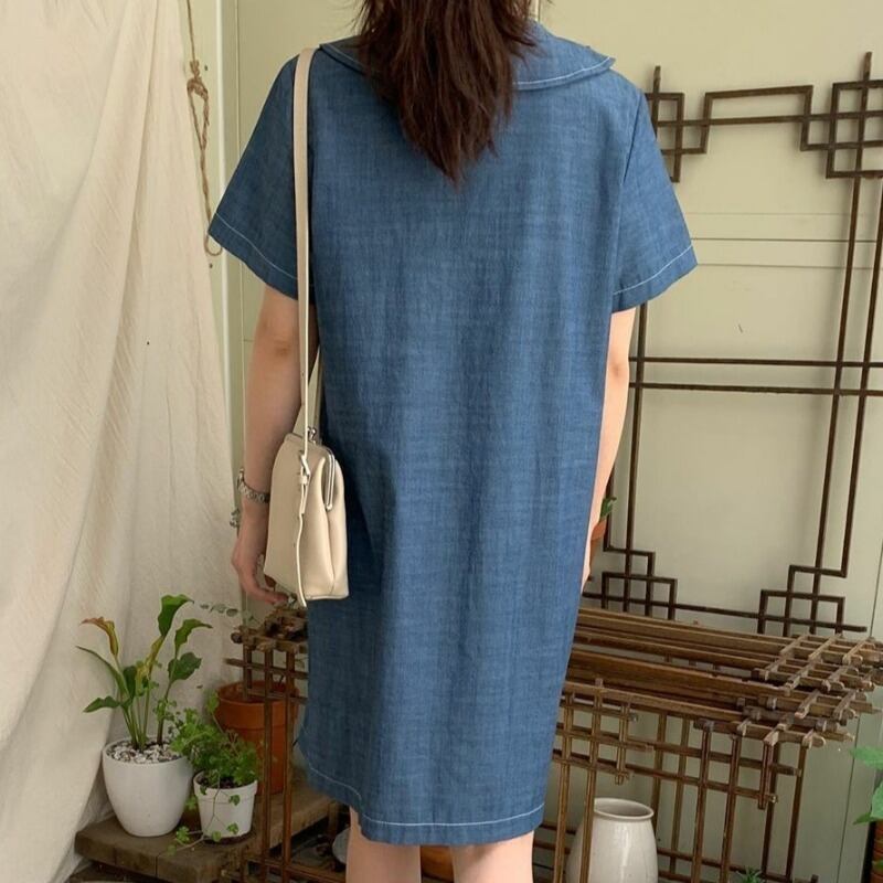 サマースタイルスタンダードブルーダブルブレストカラーラインルーズドレス レトロ 夏物 ICC_レディース1512955