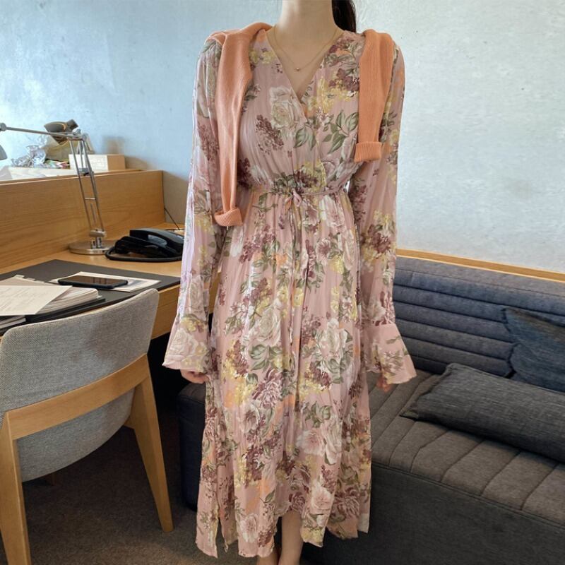 スタンダードフローラルVネック薄手ウェストロングスリーブドレス レディース レッド レトロ 花柄 ICC_レディース0149235