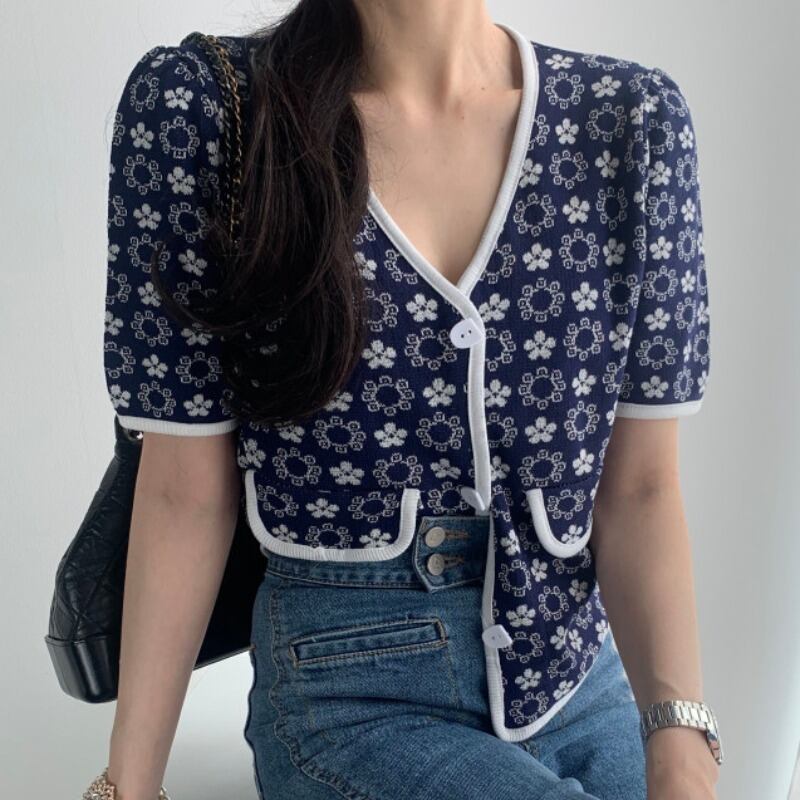 サマースリーブスタンダードVネックニットトップス 刺繍ブルーシャツ レディース レトロ 夏物 ICC_レディース2338565