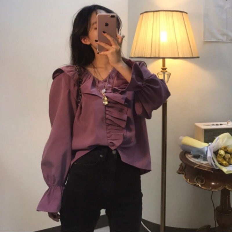 スタイルプリーツシャツ レディーススタンダードVネックルーズスリーブトップス ベルスリーブ レトロ ICC_レディース3570709