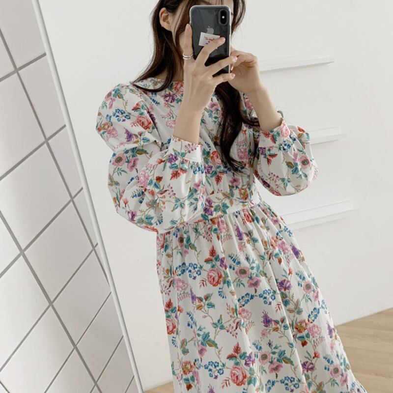 スカート スタイルスタンダードフローラルウェスト長袖スリーブドレス レディース ロング レトロ 花柄 ICC_レディース4754817