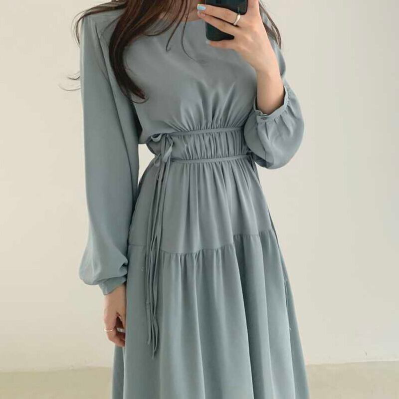 オータムラウンドネックプリーツバンドウェストスリーブドレス ランタンスリーブ 秋物 Oネック ICC_レディース6561492