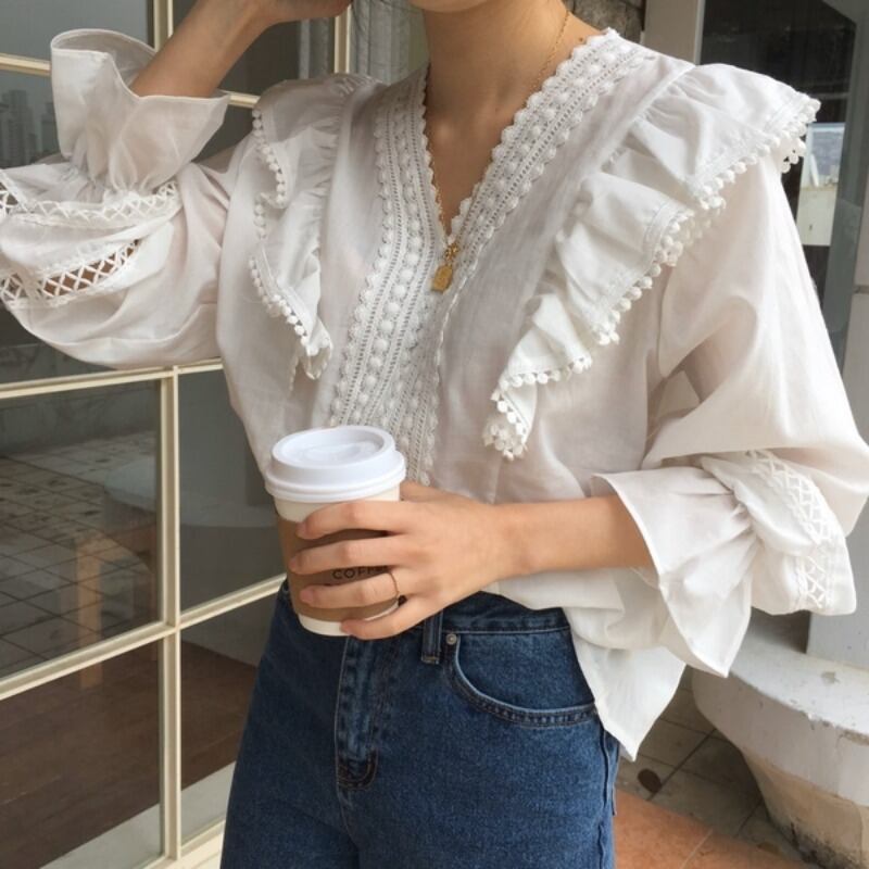 オータム薄手Vネックレーストップス ルーズスリーブシャツ レッド 秋物 ステッチ ICC_レディース0257454