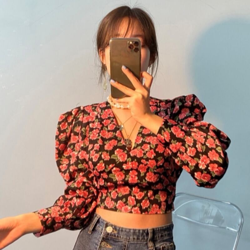 スタンダードフローラルVネックショートハイウェスト薄手スリーブシャツ レトロ レース 花柄 レースアップ ICC_レディース0331488