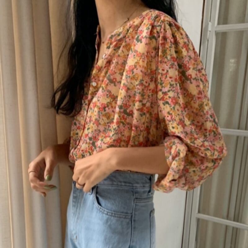 スタンダードフローラルホワイトラウンドネックルーズシフォンFlowerデザイン シャツ ブラウス レディース ロング レトロ 花柄 Oネック フラワーデザイン ICC_レディース6798636