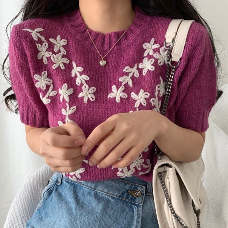 スタンダードラウンドネックFlowerデザイン 刺繍ニットトップス レディースセーター レトロ Oネック フラワーデザイン ICC_レディース2687536