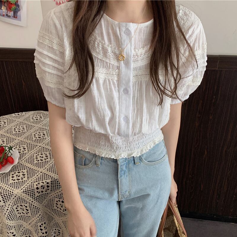 サマースタンダードホワイトシャツ ショートウェストスリーブレースレディース レトロ 大人ガーリー スウィート キュート カジュアル 夏物 左左右右8184312