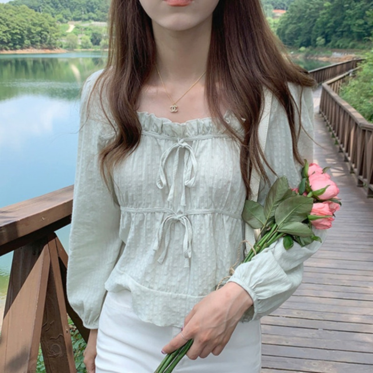スタイルショートジャカード長袖スリーブシャツ ロング レース 大人ガーリー スウィート キュート カジュアル レースアップ ICC_レディース2920398