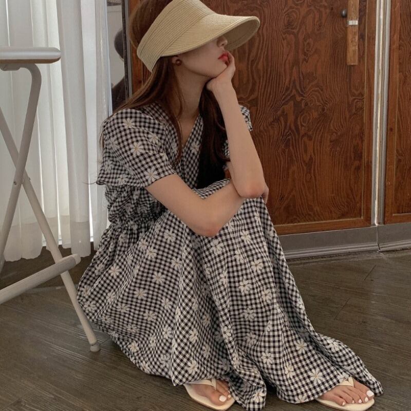 Vネックウェストロングスリーブ格子柄ドレス 大人ガーリー スウィート キュート カジュアル ICC_レディース0240968