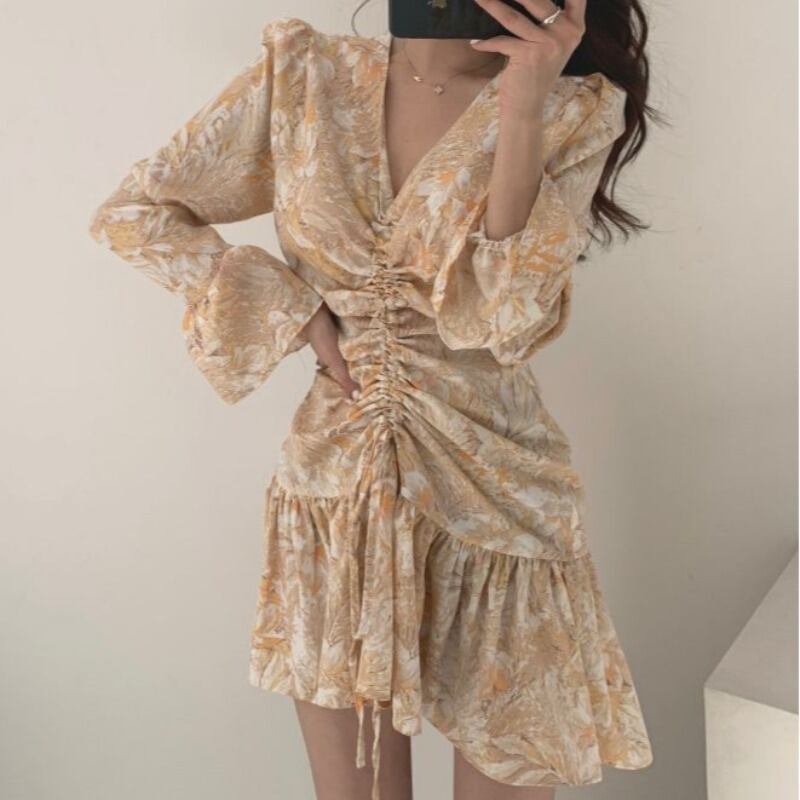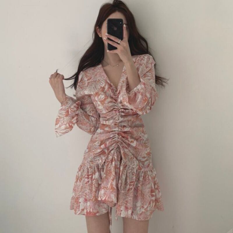 スタンダードスタイルVネックギャザープリーツシフォンフローラルドレス スカート レッド レトロ 花柄 ICC_レディース0149960