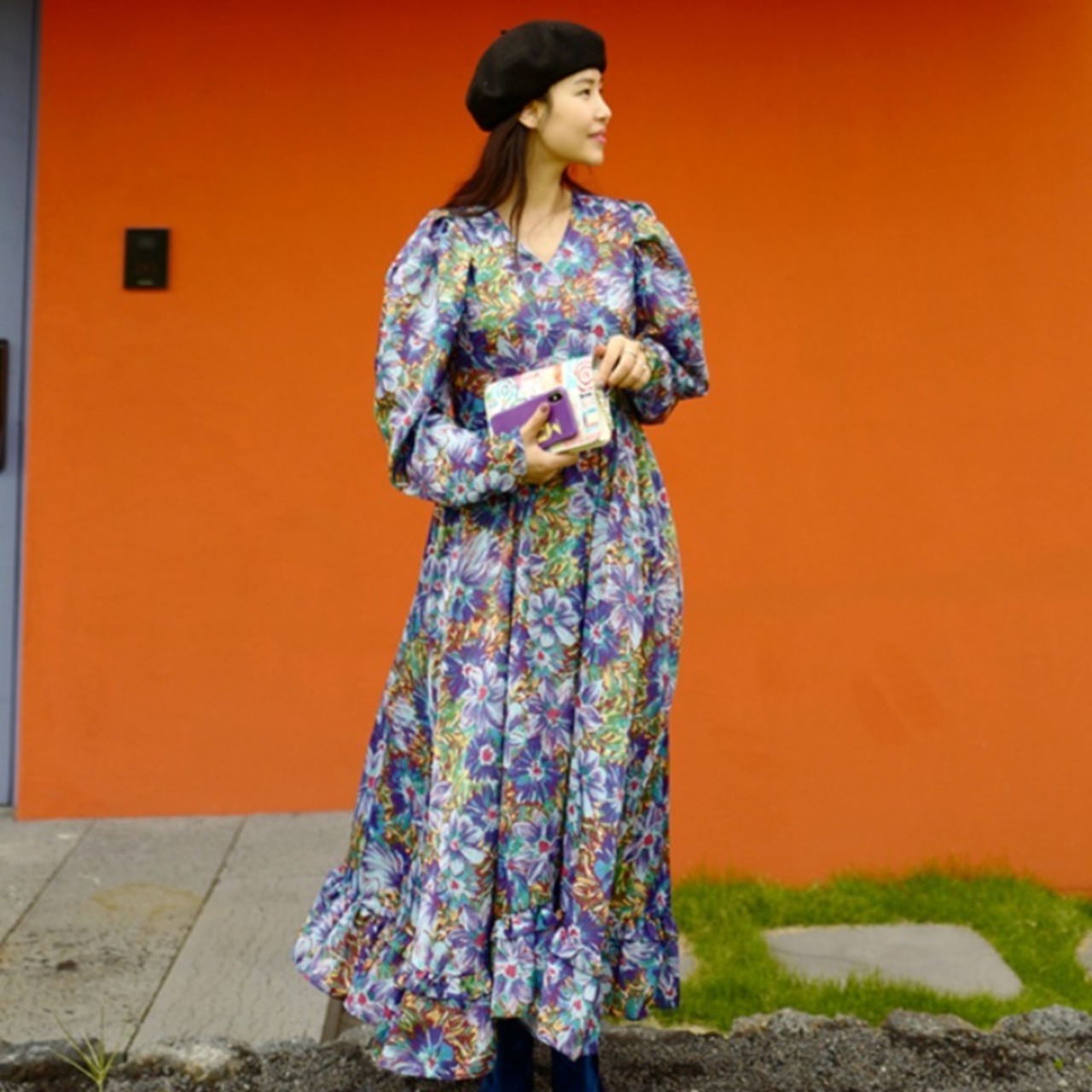 ヴィンテージFlowerデザイン プリント柄Vネックスリーブハイウェストウェストラッフルドレス フラワーデザイン ビンテージ ICC_レディース7919012