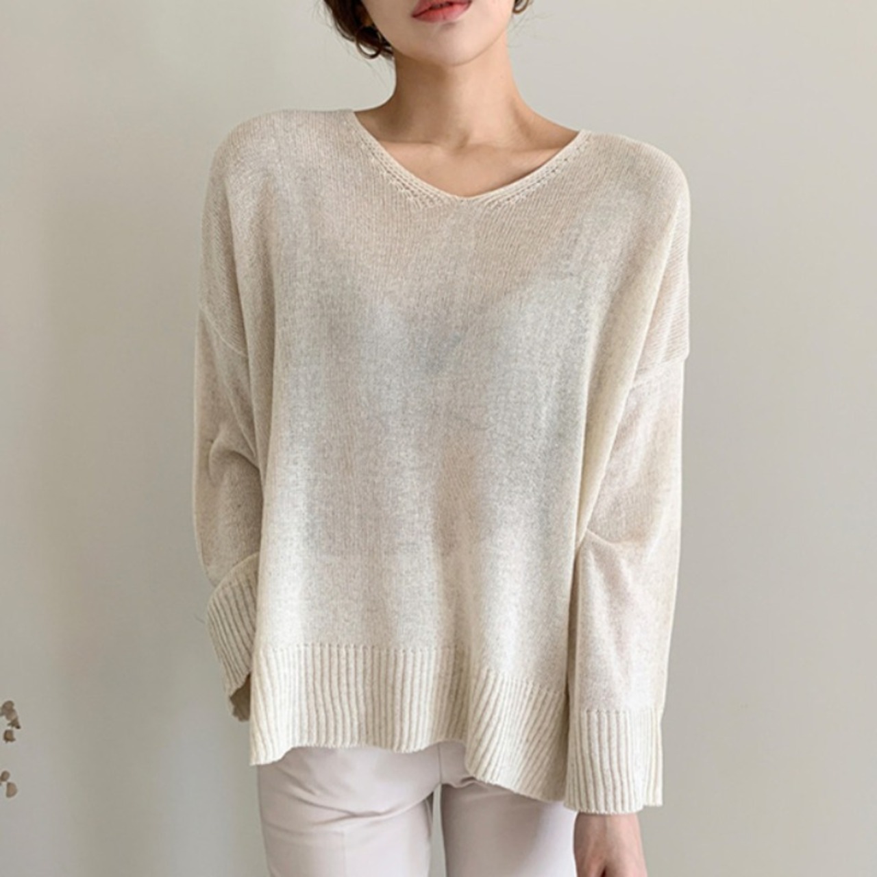 スタイルルーズVネックソリッド カラーサイドスリットスリーブセーター レディース ソリッドカラー ICC_レディース2670853