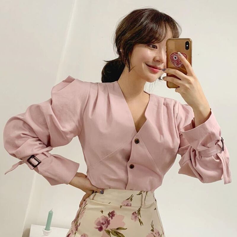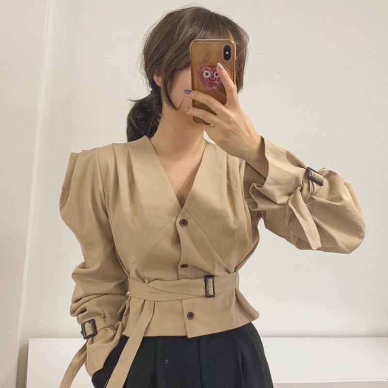 オータムスタイルスタンダードVネックウェストショートシャツ トップス レトロ 秋物 ICC_レディース9083512