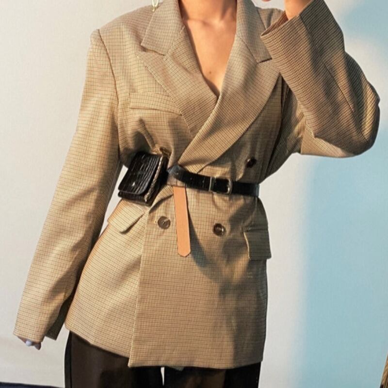 オータムスタンダードダブルブレスト格子柄ジャケット レトロ 秋物 ハーネス ベルト ICC_レディース0019595