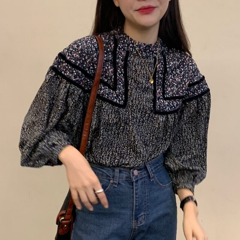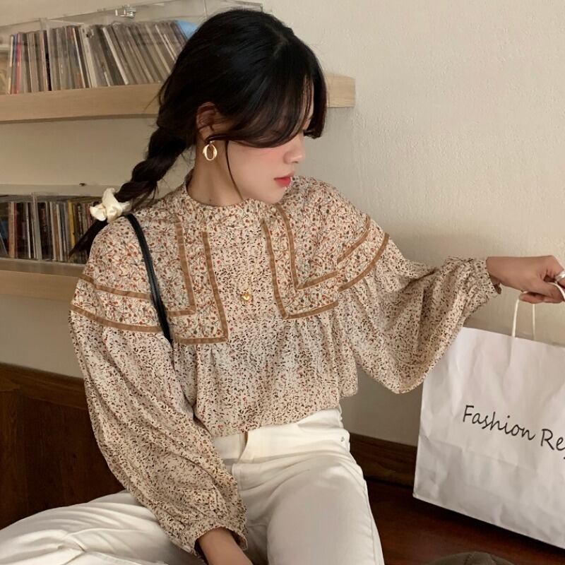 スタンダードスリーブスタンドカラーカラーフローラルシャツ ランタンスリーブ レトロ 大人ガーリー スウィート キュート カジュアル 花柄 ステッチ ICC_レディース5404435