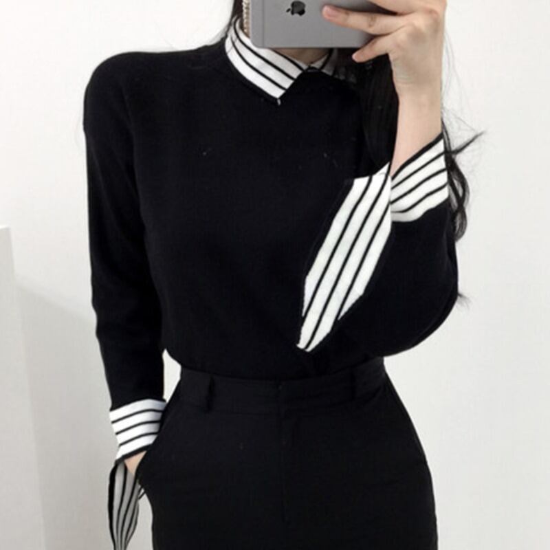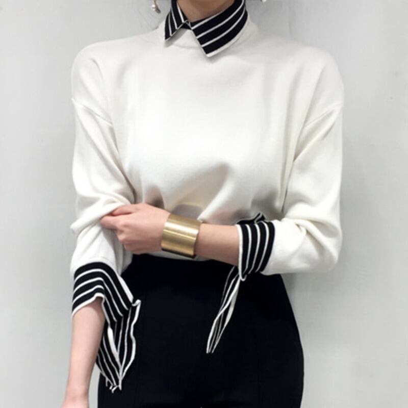 スリーブカラーストライプウールセーター スタイルオータムウィンタースリムシャツ ロング 秋物 冬物 ICC_レディース3262667