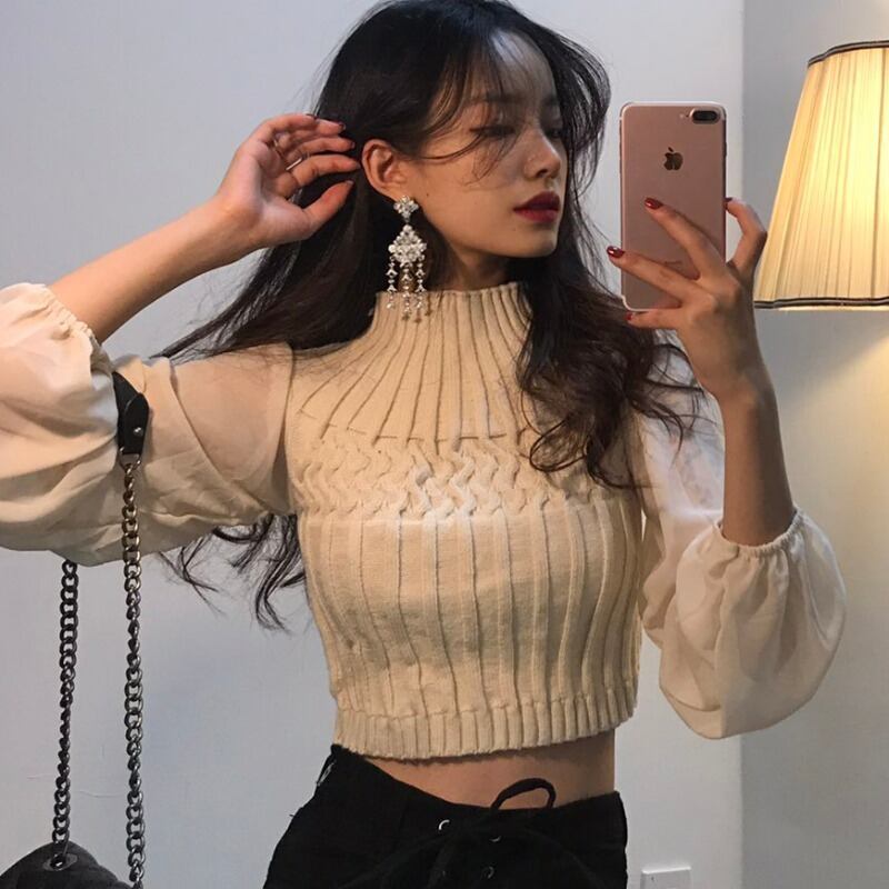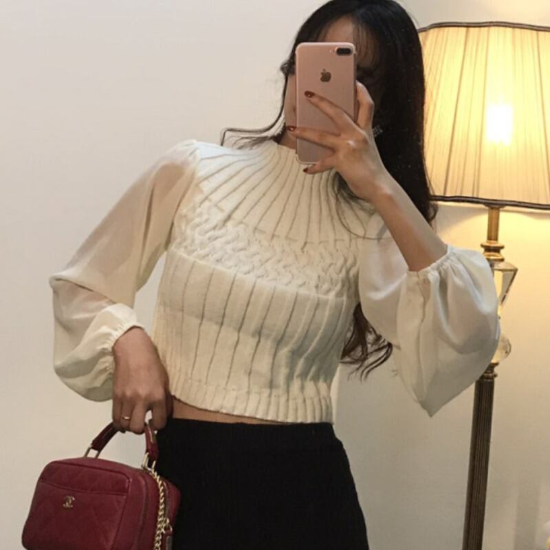 オータムスタイルシフォンスリーブコート ハイウェストウェストショートニットセーター ランタンスリーブ 秋物 ステッチ ICC_レディース6793771