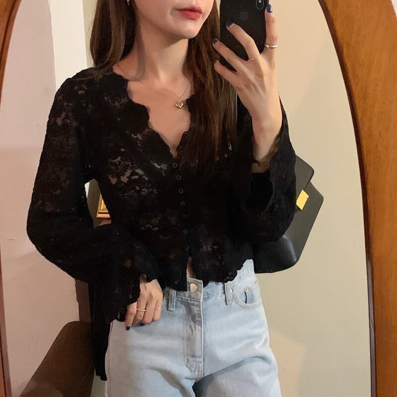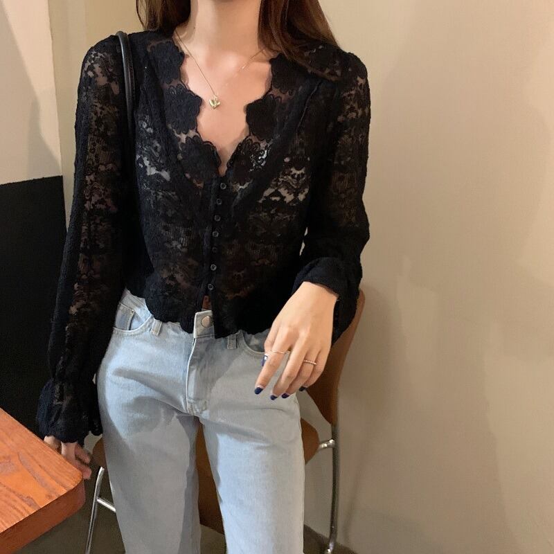 オータムスタンダードレースシャツ Vネック ロング レトロ エレガント 秋物 ICC_レディース4253469