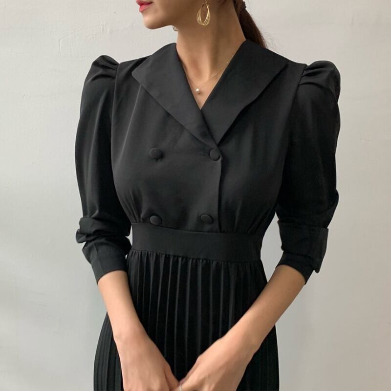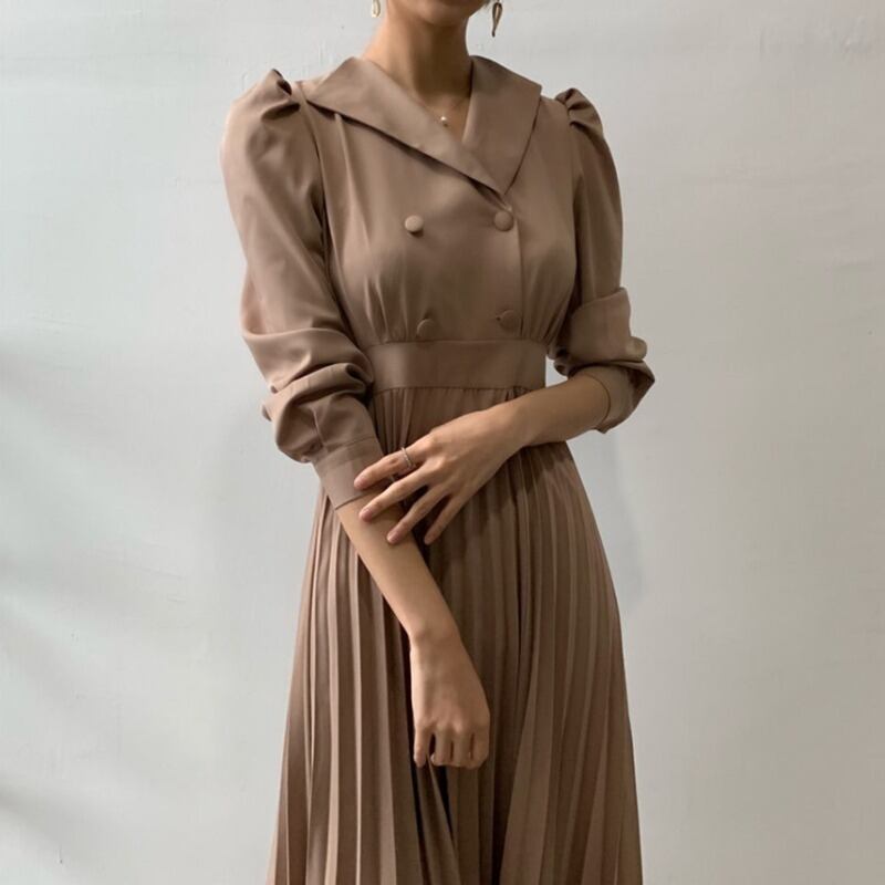 オータムダブルブレストプリーツロングスカート 薄手ドレス 秋物 ステッチ ICC_レディース7765347