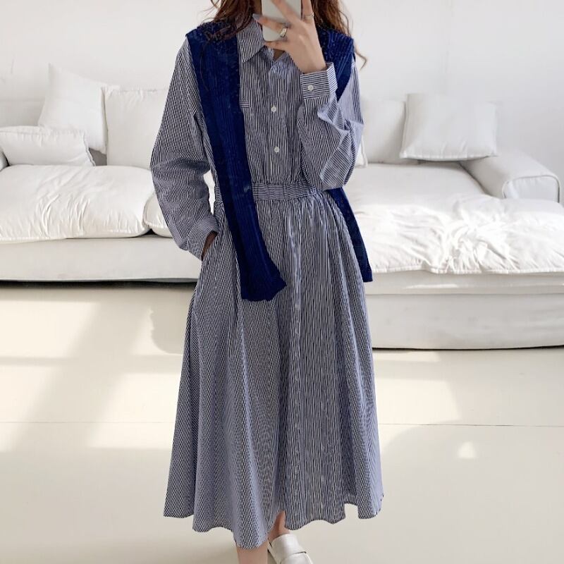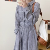 オータムウィンターウェスト格子柄ドレス 薄手シャツ ロングスカート 秋物 冬物 ICC_レディース4244022